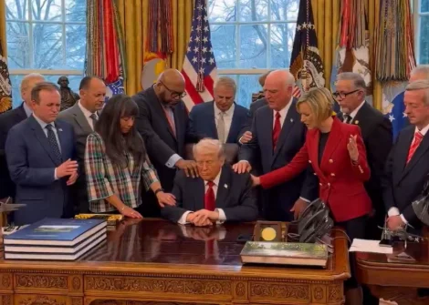 伊朗开战初期,一众来自美国各地的牧师在白宫为特朗普加持祈祷。特朗普被围绕在中央,多人将手搭在他的身上,口中念念有词。