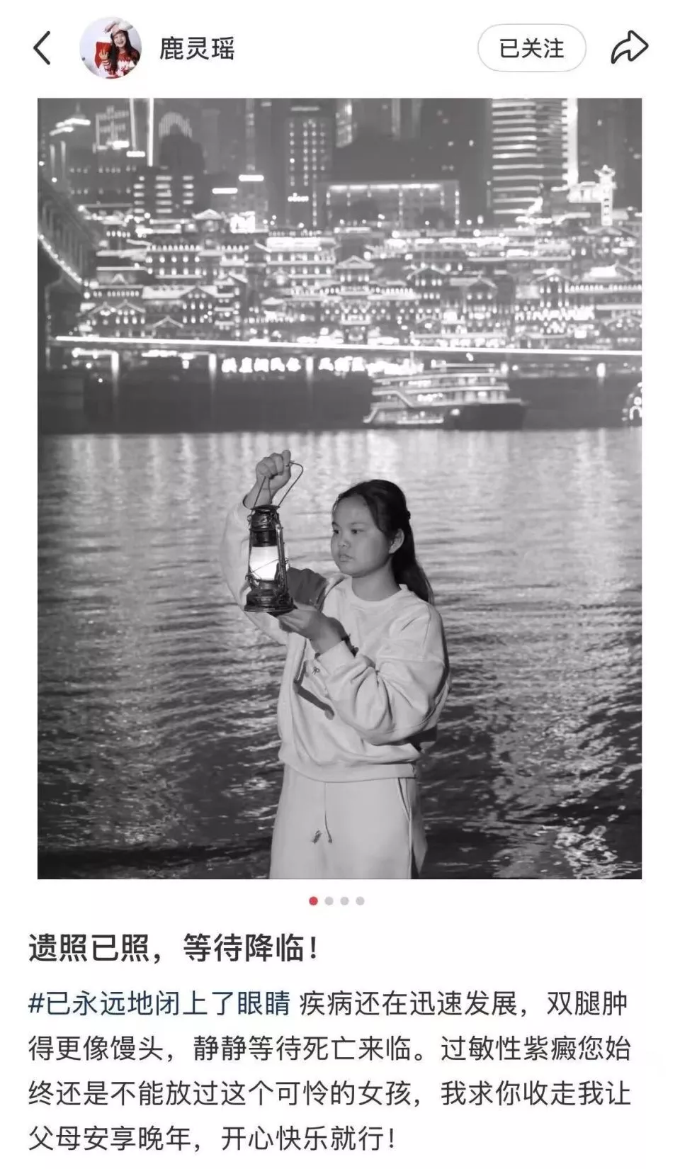 她曾在自己创办的公众号“鹿灵瑶”里描述过这种疼:胃疼时,“肚子仿佛被抛入一台失控的割稻草机,刀片参差不齐,在腹腔内肆意切割翻搅”;肾疼时,“腰像被无数细密的针刺入,又像电流在里面乱窜”;腿疼时,“每一步都像踩在刀尖火炭上”。而更多时候,这些疼,是同时发生的。