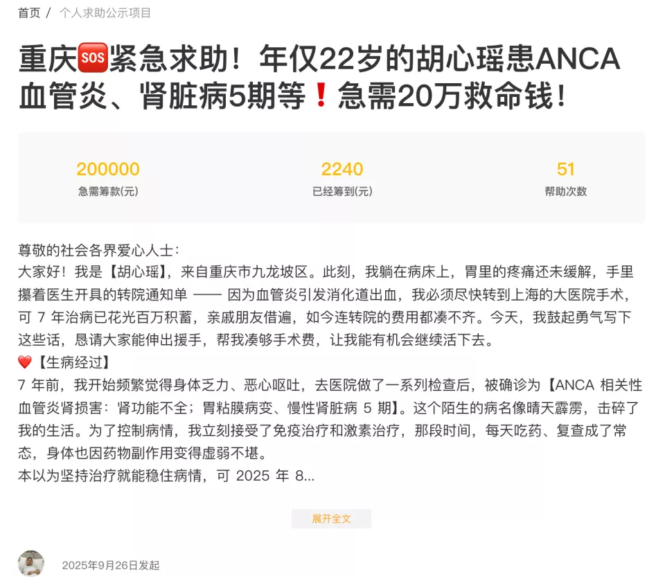 2024年,她的身体开始浮肿,重新检查后,医生给出了另一个诊断——ANCA相关性血管炎,一种更少见的自身免疫性疾病。医生告诉她,这种病无法治愈,只能控制,而且会一点一点变差。原本说不清的症状,在那之后才有了明确的解释。