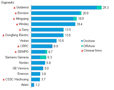 至于风电,去年全球风电整机的市场份额前六名全是中国企业: