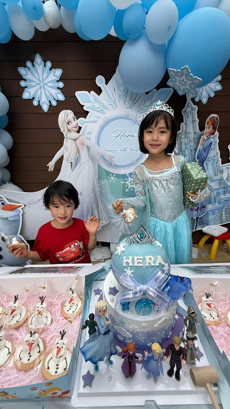 显然小珍珠面前桌子上的蛋糕也是非常吸睛的,想必是妈妈杨茜尧特地定制的,为了给小寿星一个惊喜。