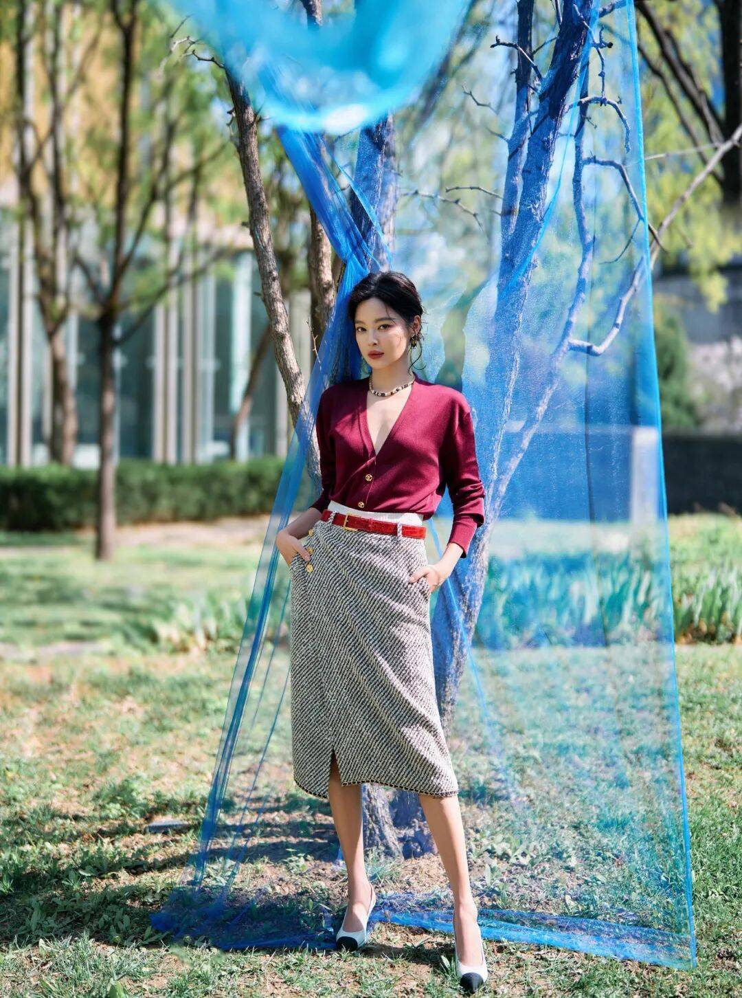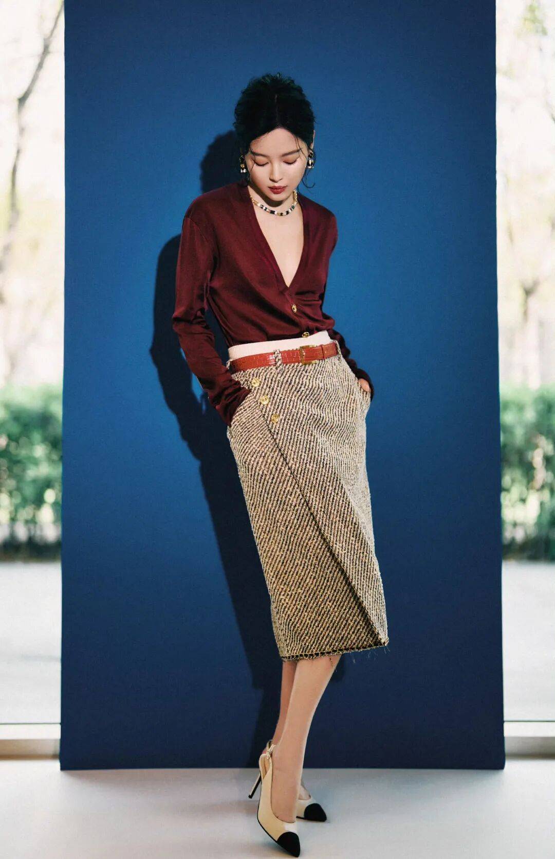 这套造型将复古与优雅演绎到了极致。酒红色深V金扣针织开衫,自带温柔滤镜,恰到好处的露肤度打破了针织的沉闷,金扣点缀更添精致贵气。搭配米黑斜纹粗花呢开叉半裙,肌理感十足,复古腔调拉满。