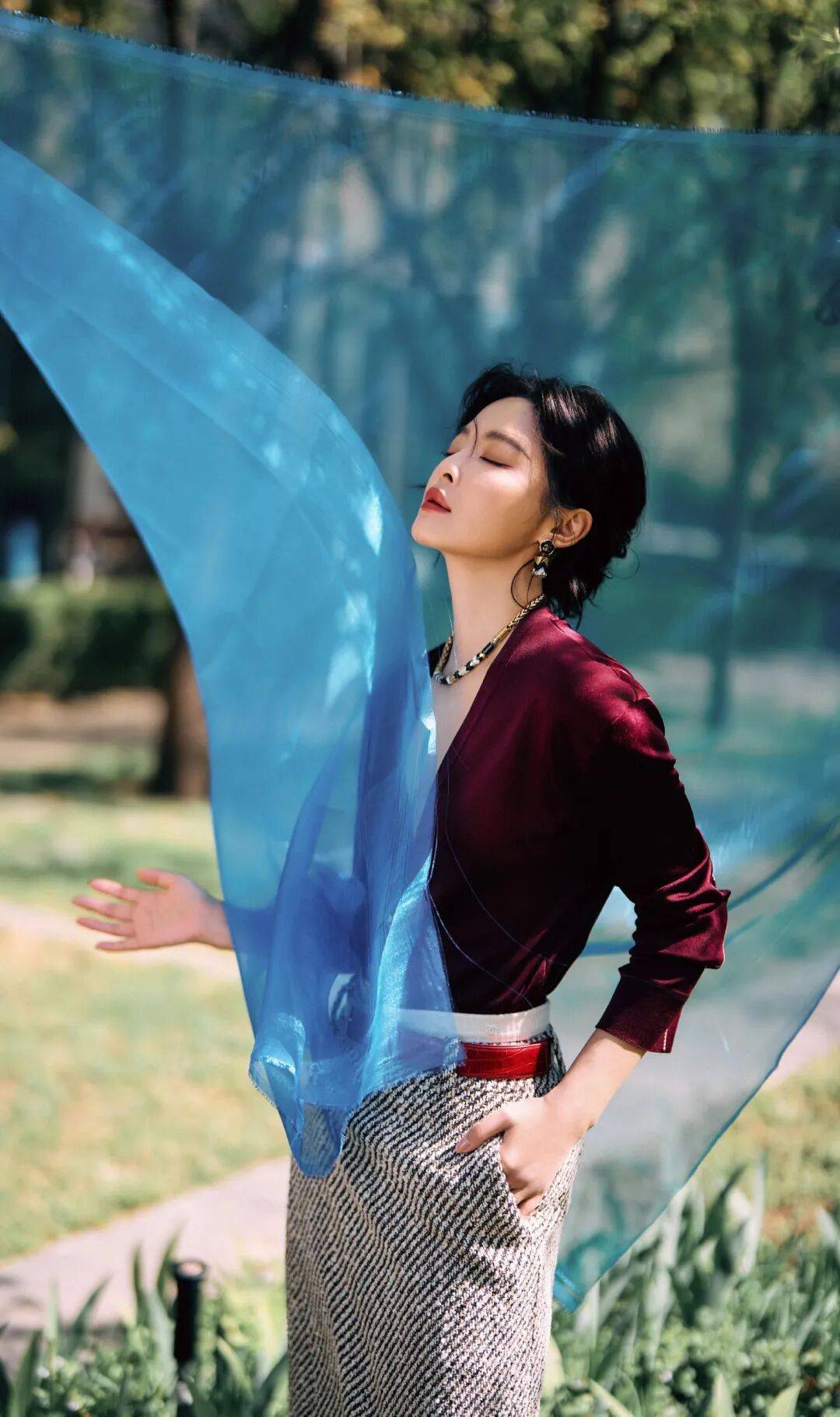 她很少穿单调的纯基础色,擅长用低饱和浓郁色打造记忆点: