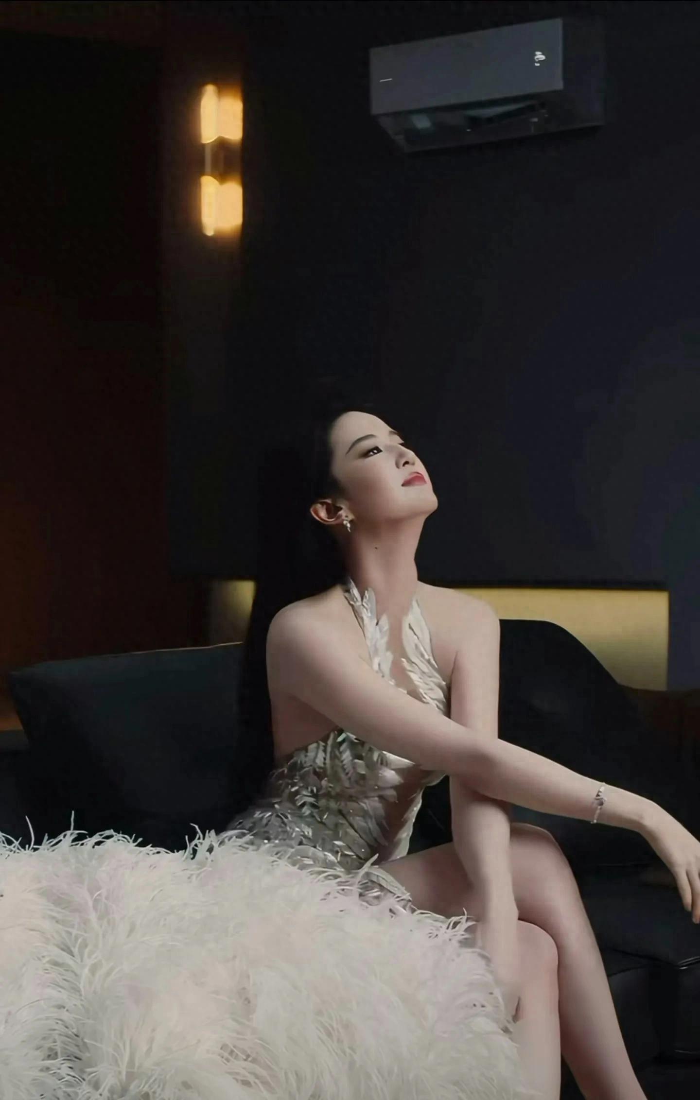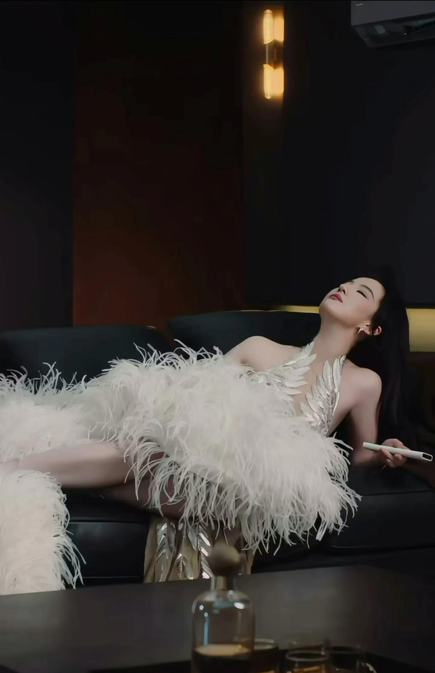 她身穿白色羽毛装饰挂脖裙,慵懒地斜倚在深色沙发上。蓬松的羽毛裙衬得她肌肤胜雪,精致的金属叶片装饰又增添了几分高级的冷艳感。她微微仰头闭眼,神态松弛又带着一丝漫不经心的魅惑,手持白色遥控器的瞬间,更是将优雅与性感完美融合。