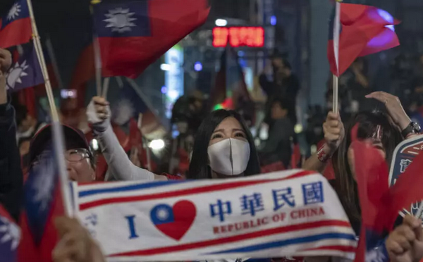 这张照片拍摄于2020年1月11日星期六,照片中,国民党(KMT)的支持者在台湾高雄举行的总统选举中挥舞着台湾旗帜欢呼。 (AP Photo/Ng Han Guan) AP - Ng Han Guan