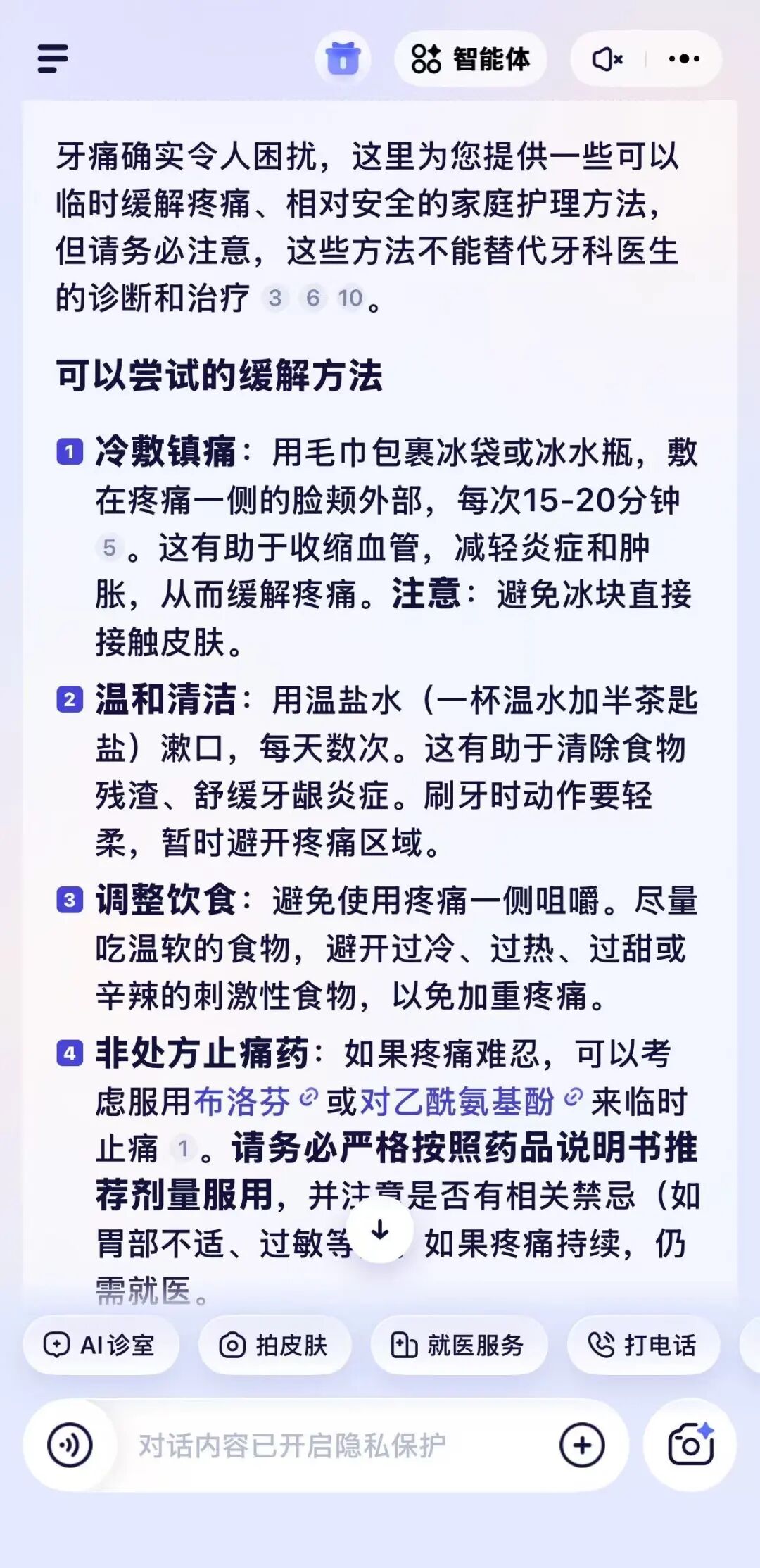 土土从诊所出来后,打开蚂蚁阿福和 DeepSeek,输入了自己的情况。阿福给出了临时缓解的方法:先消炎、用温盐水频繁漱口、避免用患侧咀嚼,实在疼痛难忍可考虑用布洛芬止疼。同时阿福也明确告诉他:这些方法只能短暂帮你控制住局面,还是得尽快找牙医处理。