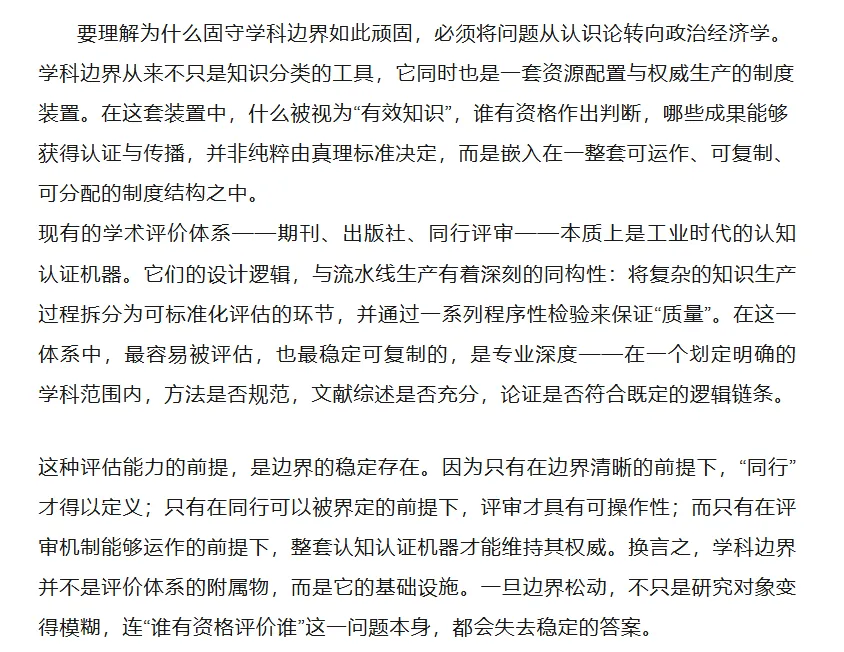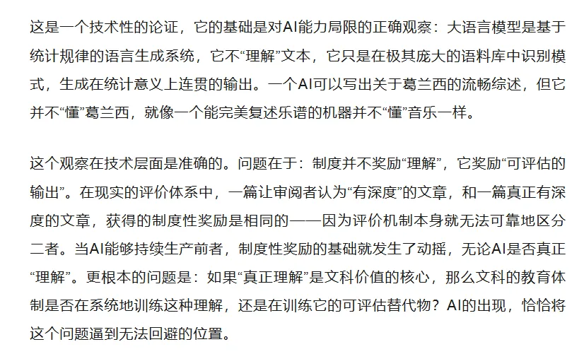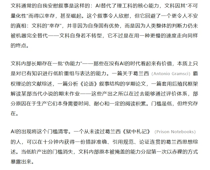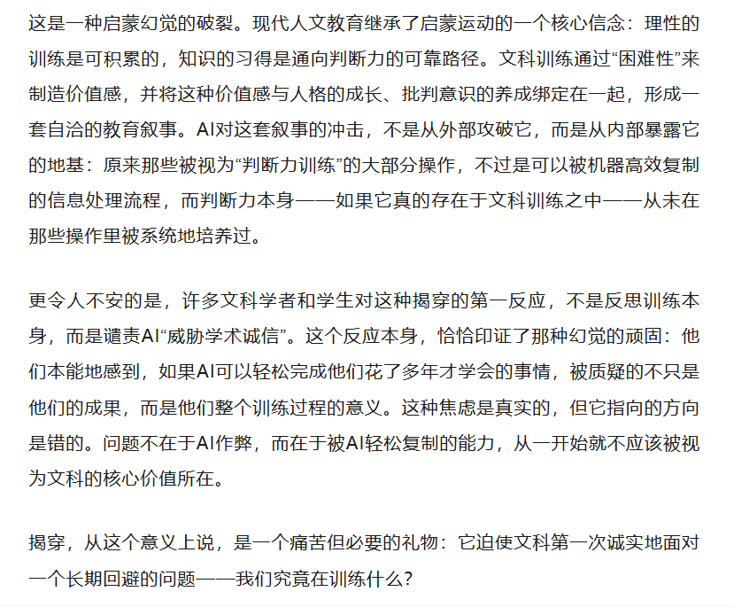 正是在这个意义上,固守学科边界的文科,呈现出一种表面稳固而内在脆弱的状态。它看似拥有清晰的规范、成熟的评价机制与悠久的传统,实则在其最基础的层面——对何为有效训练、何为学识或学问、何为真实判断的理解——上正在失去支撑。一旦那些可以被AI轻易复制的部分不再被误认为核心,整个体系的重心便出现了不可逆的漂移。
