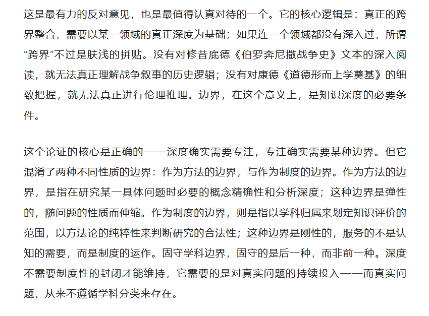 在推进论证之前,有必要认真对待反对意见的最强版本。固守学科边界的立场,并非没有智识基础,草率地将其驳斥为保守主义,反而会使批判失去应有的说服力。