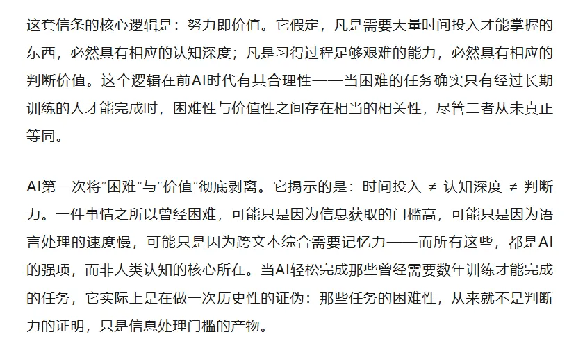 但这种暴露,其真正的深度,远超一般所描述的“能力危机”。它动摇的不只是某类技能的市场价值,而是文科训练赖以维系自身正当性的一套隐含伦理——一种可以被称为“知识苦修主义”(epistemic asceticism)的价值信条。