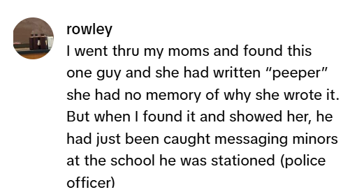 我翻我妈的年鉴,看到有个男的旁边她写了“peeper”。她完全不记得为啥写这个。结果我拿给她看时,新闻刚好爆出来,那人当时在学校当驻校警察,被抓到给未成年人发消息……真的鸡皮疙瘩。