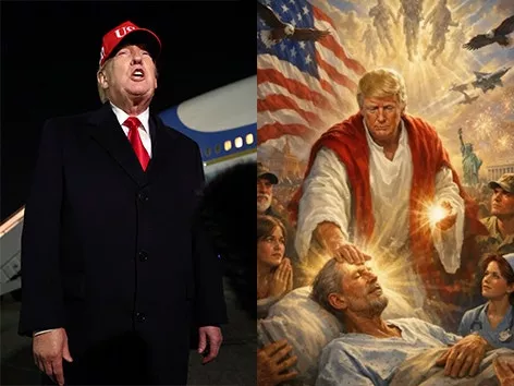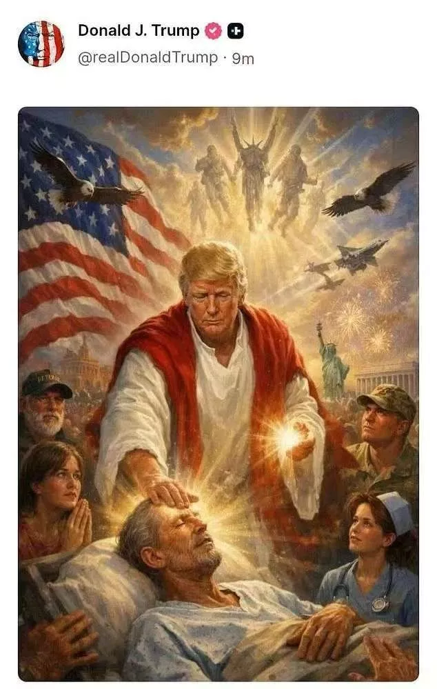 川普又发布了那张极具争议的AI生成图片,图中他身着白袍,手发光芒,正在“治愈”一名病人。背景融合了美国国旗、战斗机和自由女神像等元素,呈现出一种强烈的、类似耶稣的救世主形象。川普在发布图片其后又删除,辩称只是“作为医生让人们康复的样子”。但这种解释被广泛认为是苍白无力的。