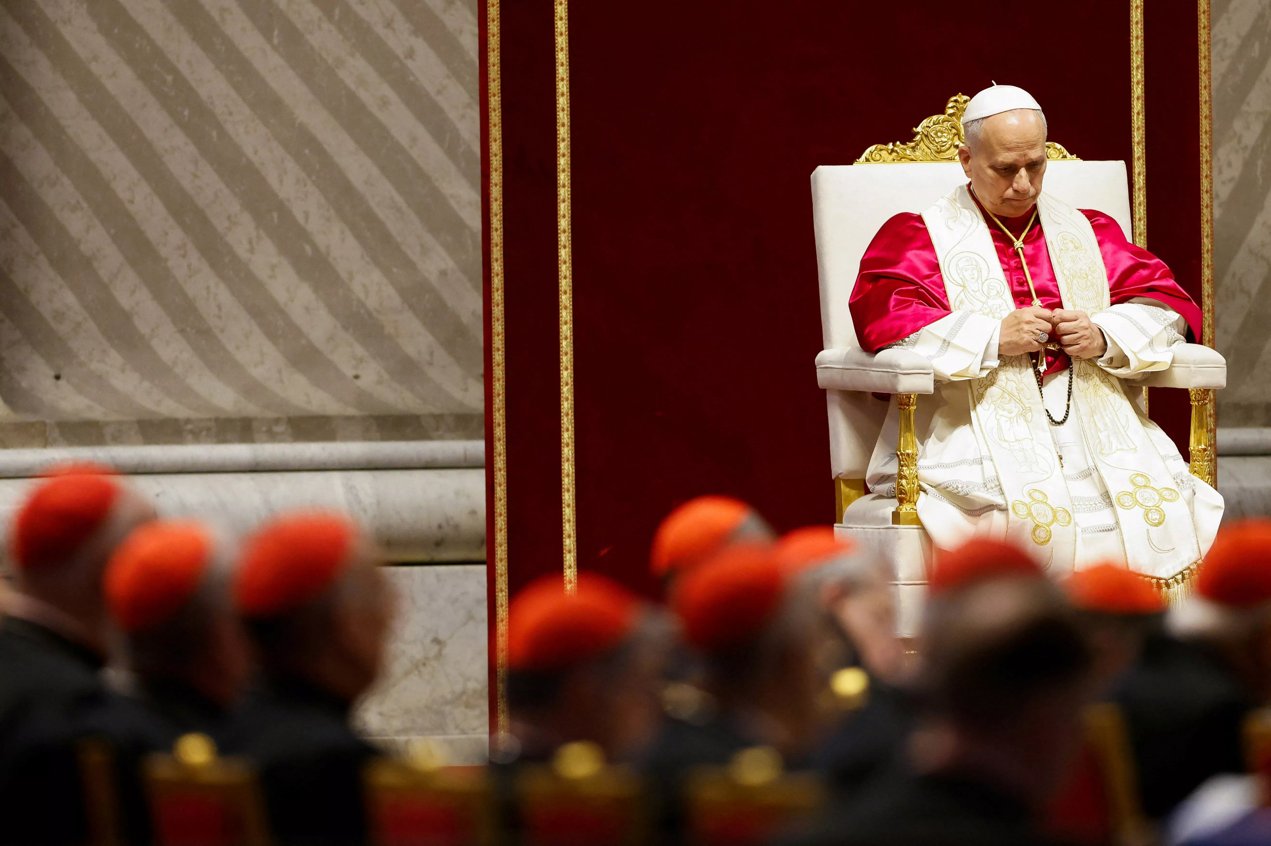 2026年4月11日,教宗利奥十四世(Pope Leo XIV)在梵蒂冈圣彼得大教堂主持和平祈祷守夜及默念玫瑰经。(Reuters)