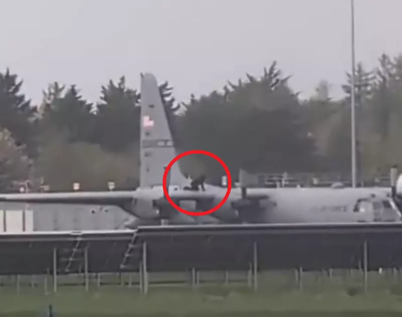 离谱!男子闯禁区 爬上机翼狂砍美军C130军机!