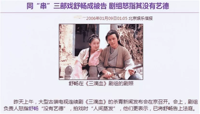 2005年,舒畅签约古装剧《三滴血》担任女一号,但拍摄期间她频繁请假,以“回校考试”“生病就医”为由多次离组,随后剧组扬言要将她告上法庭。