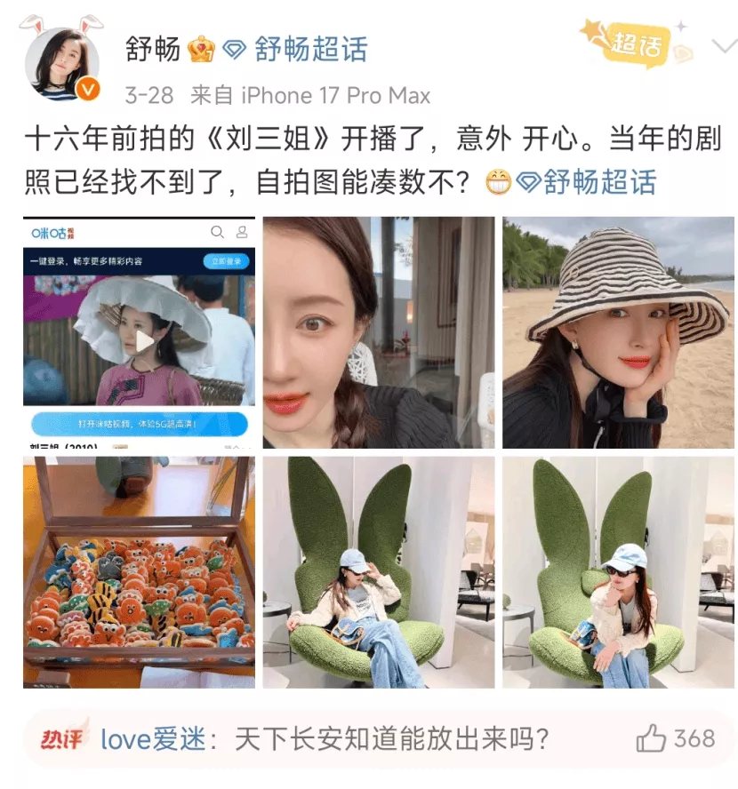 剧集开播当天,她发了条微博关于热播的感受,就只有简简单单四个字——“意外开心”。甚至还因为已经找不到当年的剧照,配图是几张近期的自拍。