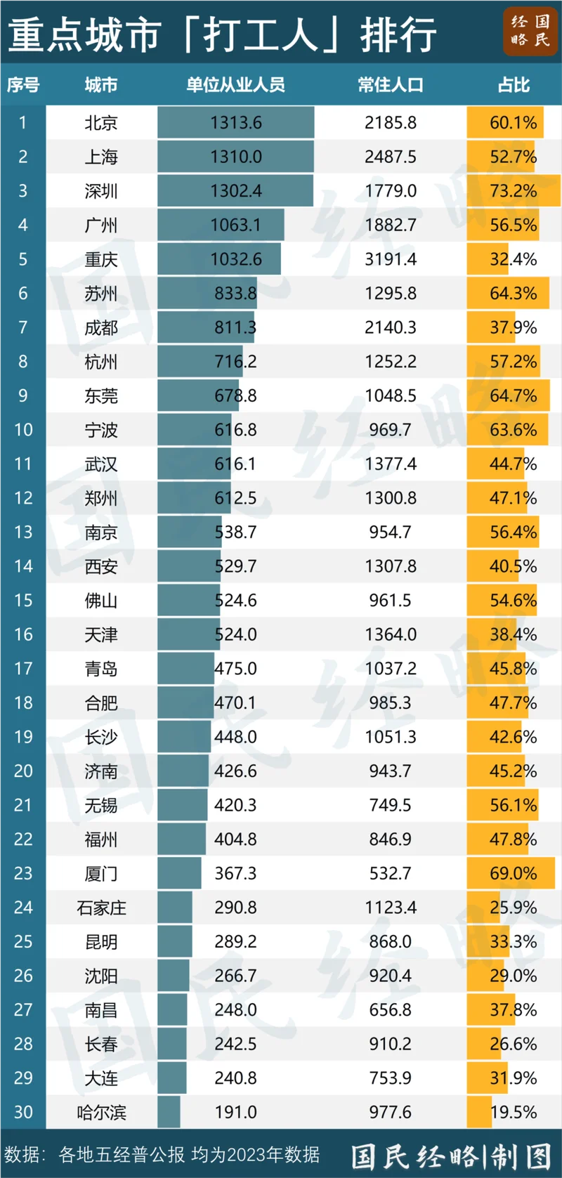 如果从“打工人”占全体人口比重来看,深圳则成了毫无疑义的“打工人”第一城。
