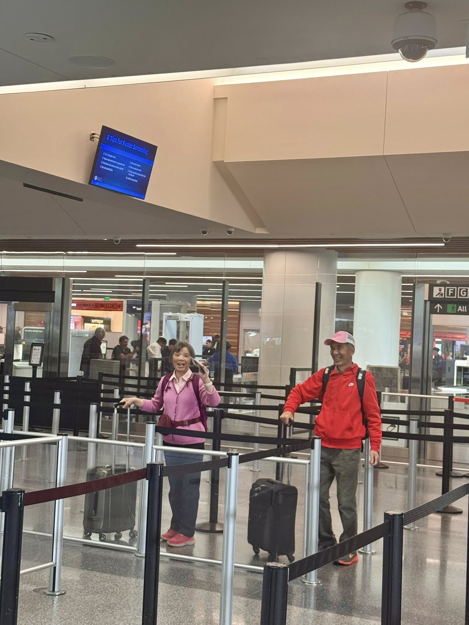 今天爸爸妈妈回国了,我带着爱美丽去送他们。