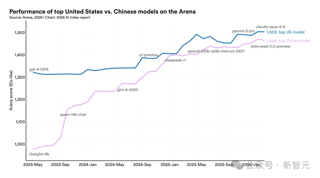 2026年3月,美国的Claude Opus 4.6拿到1503分,中国dola-seed-2.0-preview拿到1464分。