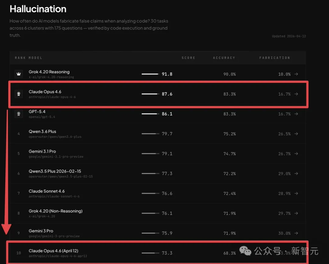 而且,BridgeBench评测显示,Opus 4.6幻觉翻倍,准确率暴跌15%。