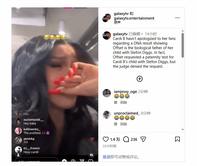 2026年4月13日,CardiB在前夫Offset的质疑下,给第四个孩子做了亲子鉴定,结果发现真是前夫Offset的,不是现任Steflon Diggs的,她在直播中崩溃大哭。