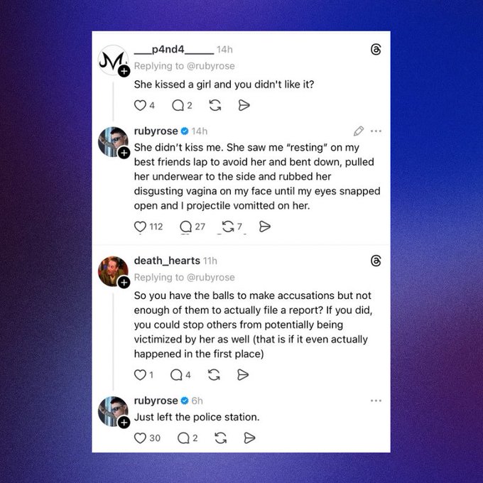 这次指控来自澳洲女星露比萝丝(Ruby Rose),她曾演出电影“蝙蝠侠”(Batman)及影集“劲爆女子监狱”(OrangeIs the NewBlack)。40岁的她在社群平台Threads回应一篇关于凯蒂佩芮出席科切拉音乐节的报导时,突发文指控天后曾对她性骚扰、性侵。