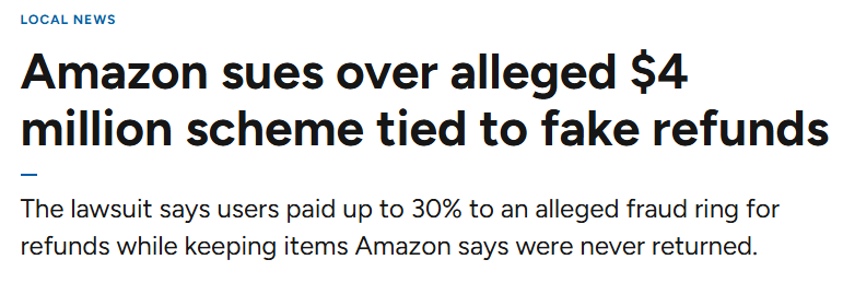 亚马逊周二在西雅图提起联邦诉讼,指控一个名为RBK的团伙通过虚假退款行为获得了超过400万美元的退款,但产品实际上未被退还。