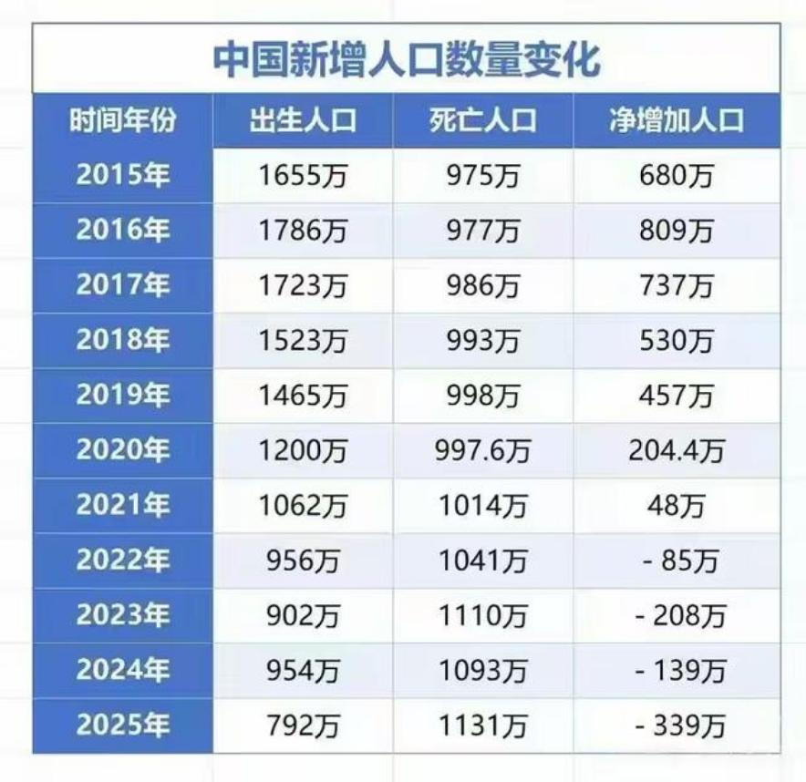统计口径显示,2025年出生人口792万人,死亡人口1131万人,人口总量同比减少339万人。
