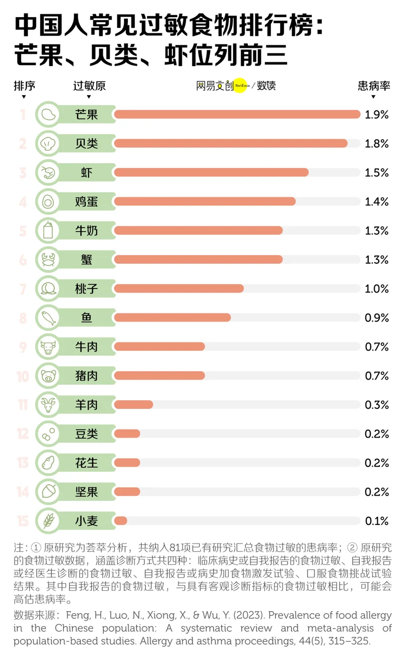 如果要问哪些食物最常惹祸,这项研究给出的结论是芒果、虾、鸡蛋、牛奶和蟹,也就是海鲜和部分水果的食物过敏患病率较高 [2]。