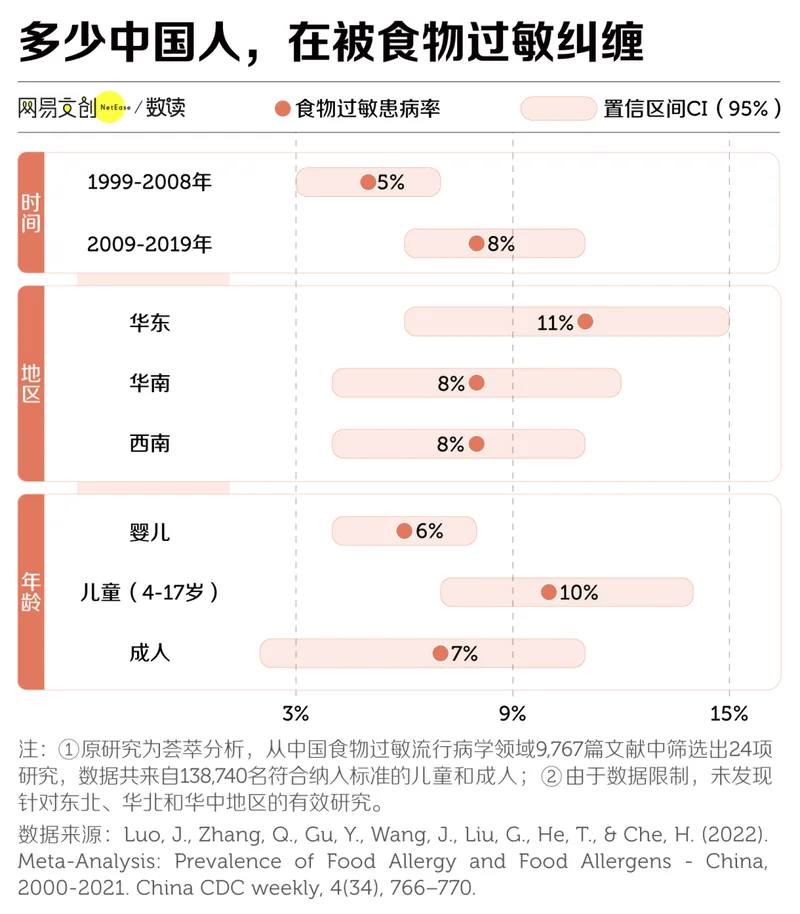 另一项发表在《中国疾控中心周报》的研究,把全国划分为六大区域后发现,在已有数据较多的地区中,华东的食物过敏患病率最高,可达 11%,高于华南和西南的约 8% [3]。