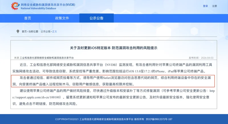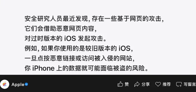 内容也很简单,就是旧版本的 iOS 存在安全漏洞,一旦点到恶意链接,iPhone 上的数据就可能面临被盗的风险。