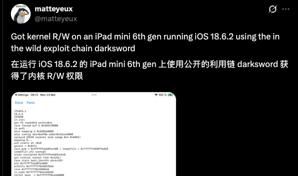就在今年 3 月份,还有网友展示如何盗取老设备的权限,其中用到的正是已经公开的 DarkSwrod 漏洞链,而运行的系统也是没被补丁覆盖的 iOS 18.6.2。