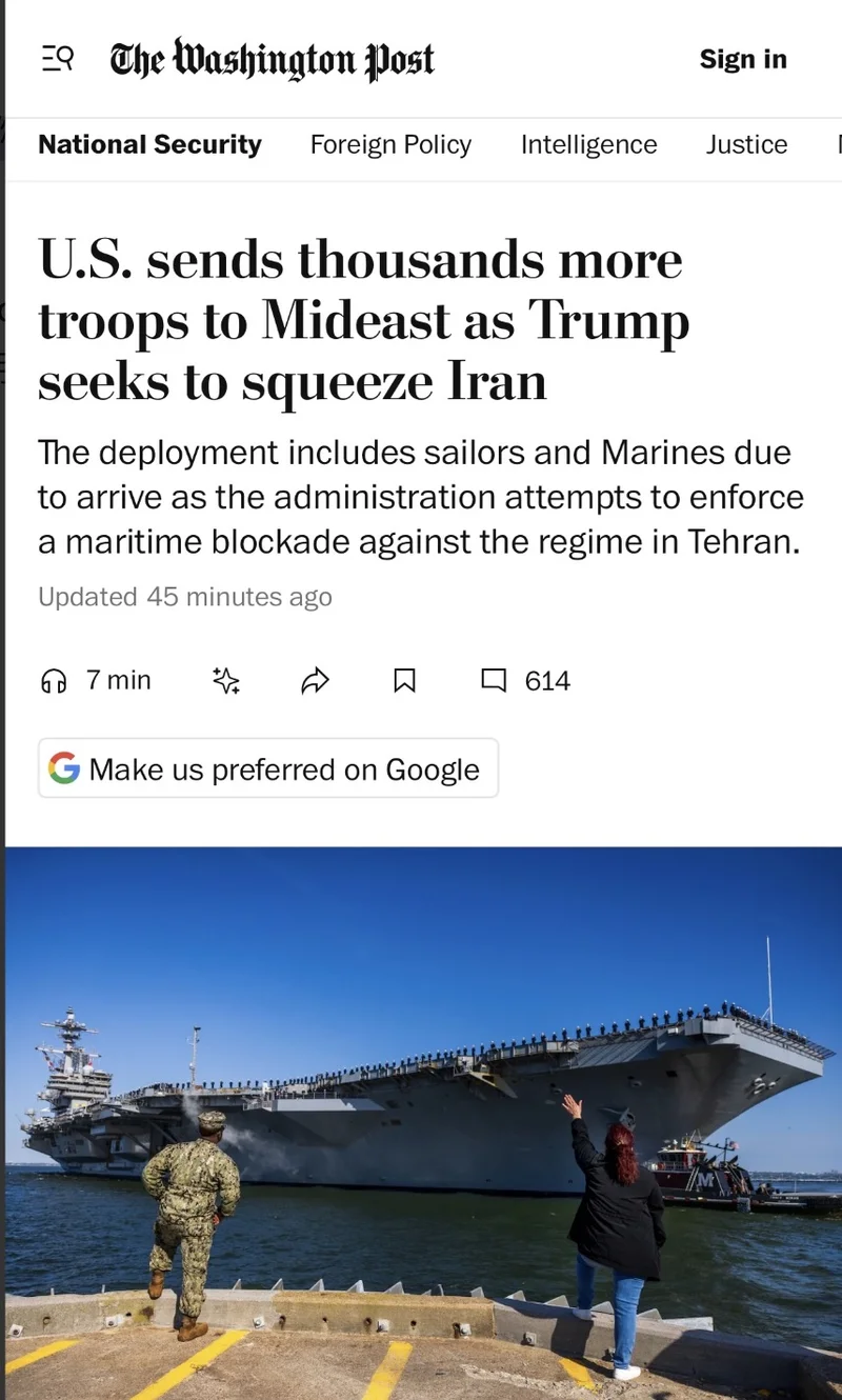 报道说,就在为期两周的停火定于4月22日到期时,增援的打击兵力似乎会与已部署在中东的军舰汇合,增援部队将加入五角大楼声称的、参与打击伊朗行动的约5万名军队内。