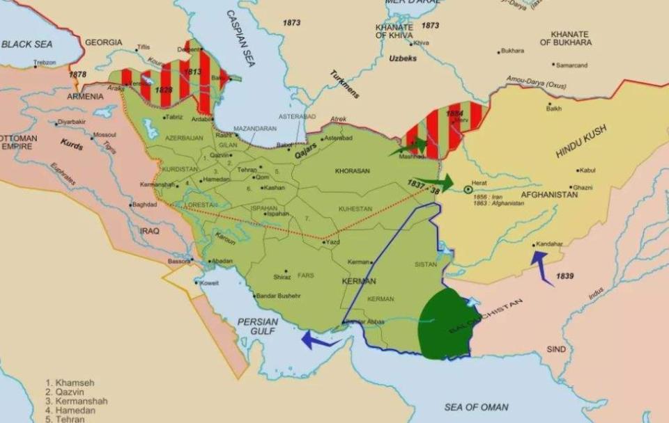 19世纪初期,沙俄多次南下后,直接吞并了高加索地区。到了1813年,沙俄通过多次战争的胜利,逼着波斯签订丧权辱国的《古利斯坦和约》,自此沙俄从波斯手里夺走了达吉斯坦、格鲁吉亚、阿塞拜疆以及亚美尼亚的部分地区。波斯彻底失去了对高加索地区的控制权。