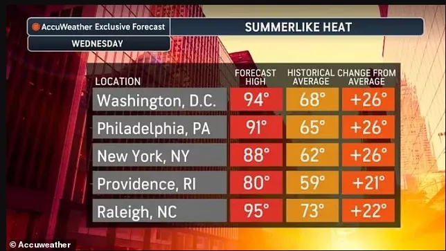 其中纽约最高温预计接近90°F;华盛顿DC、巴尔的摩、里士满将达到90°F以上,北卡罗来纳州罗利预计升至95°F。而在往年,这个时间段的正常气温,通常只有60多华氏度。一下子比正常水平高出20°F以上。