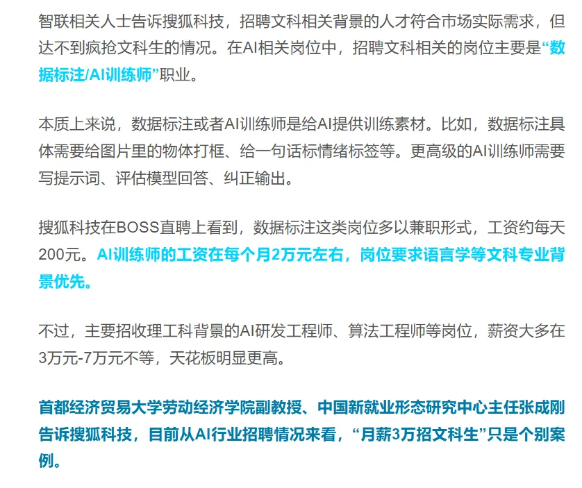 不过,也有不少质疑的声音认为,AI大厂月薪3万疯抢文科生仅仅是个例,大部分都是给AI打标签、打分这样可替代性很强的数据标注类工作,少数高薪岗位对学历和经验要求都非常高。