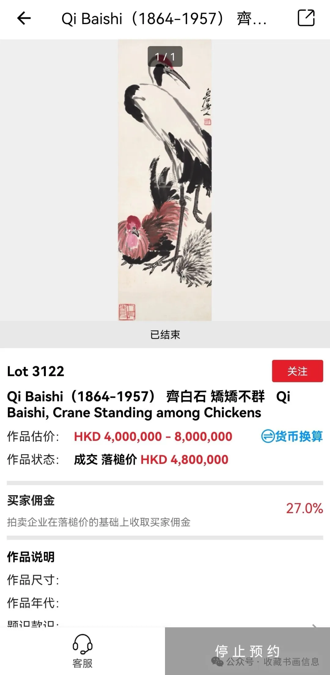 元帅旧藏,“鹤立鸡群”——齐白石614万成交搜狐艺术