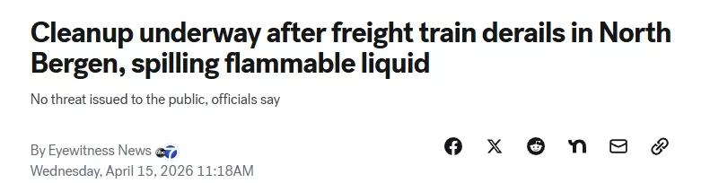 载有易燃化学品列车脱轨 新泽西近12节车厢出轨