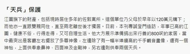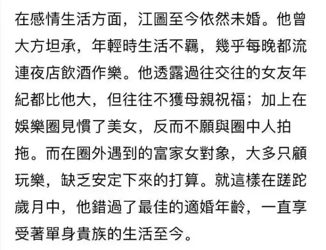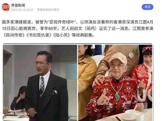 据多家港媒报道,被誉为“亚视传奇绿叶”、以饰演反派著称的香港资深演员江图4月15日因心脏病离世,享年89岁。 艺人田启文(田鸡)证实了这一消息。江图曾参演《民间传奇》《书剑恩仇录》《陆小凤》等经典剧集。 江图一生并未经历婚姻也没有儿女。 他曾经表示已经将后事交给古天乐、田启文等人去处理。 据悉,2月是江图最后一次公开露面,当时他穿着喜庆现身演艺人协会会员春茗,他对着镜头毕业状态不错。