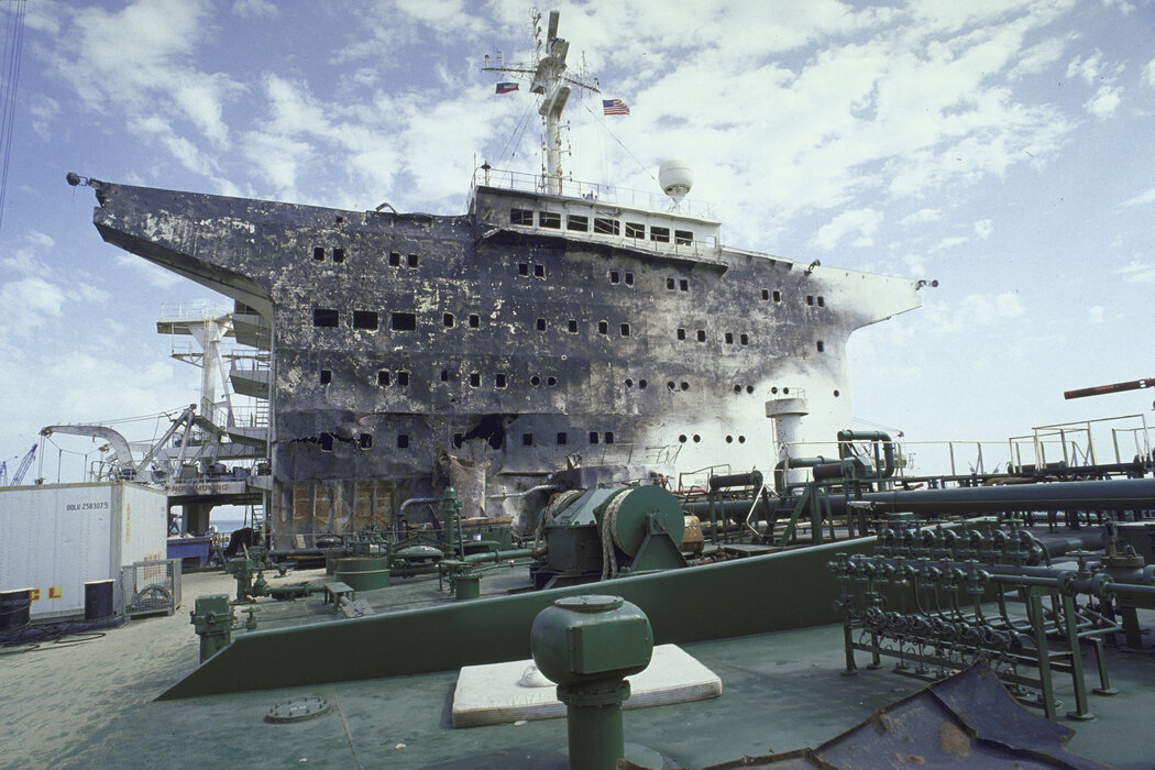 1987年,一艘名为“海岛城号”的美国注册油轮在科威特水域被伊朗导弹击中后的情景。美国随即限制向中国出口部分高技术产品。中国否认直接向伊朗出售武器,但表示将采取更多措施,防止其军品出口通过中间商流向伊朗。