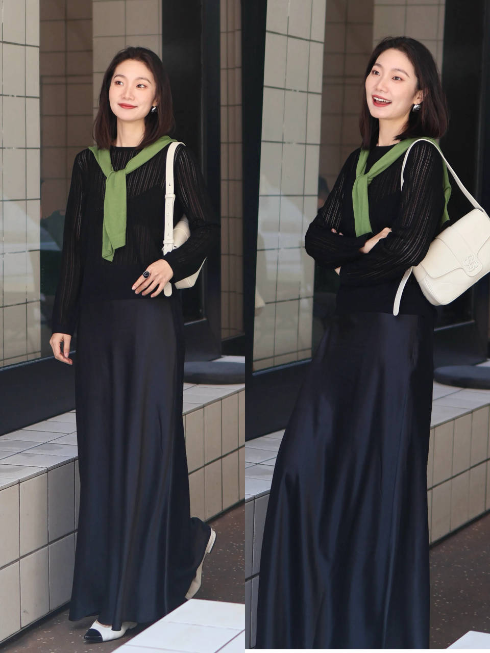 part①:透明太黑色针织衫搭配真丝面料半裙,高贵典雅