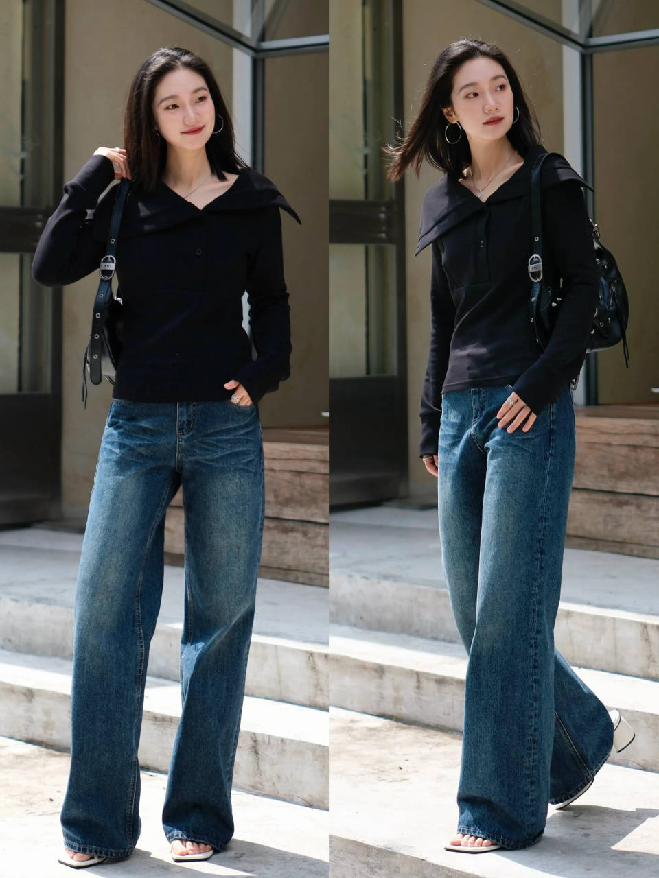 Tips①:黑色针织 polo 衫+牛仔直筒裤