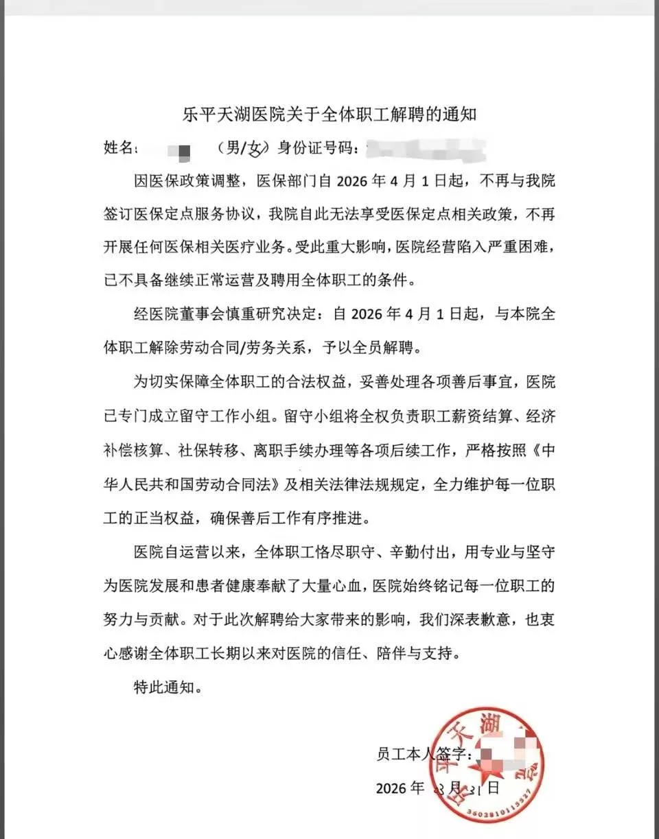 3月31日,天湖医院发布解聘全体员工通知的同一天,乐平市医保局也发布通告,正式解除与该院的医保服务协议,并取消其医保定点资格。