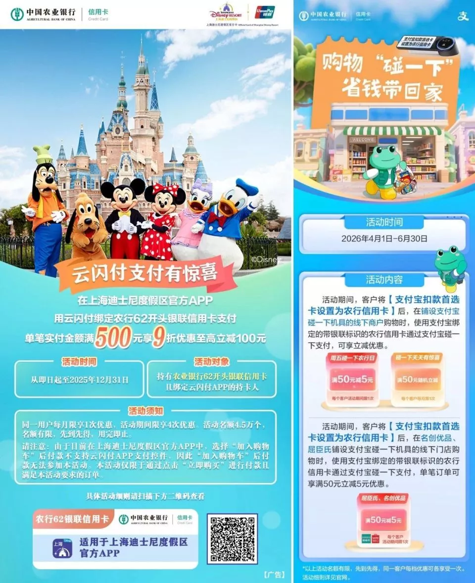 农行就联动迪士尼开展门票专属立减活动,机票、高铁、住宿、餐饮一并配了返现和立减权益。把这条出行链路全覆盖了,省的是一整次旅行的总费用。