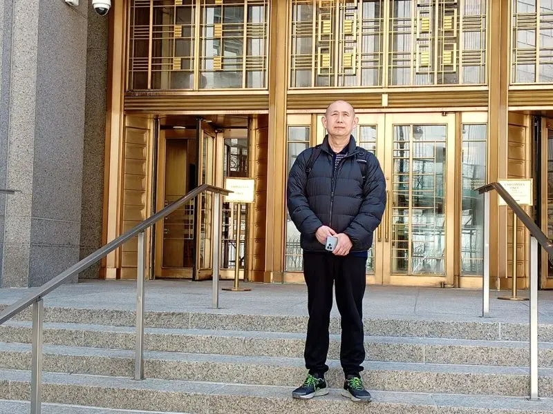 根据诉状,王永红2024年在纽约中领馆外和平抗议时涉被领馆保安打伤,市警(NYPD)警员未留下任何出警和执法纪录。王永红向曼哈顿联邦法院控告纽约市府存在系统性漠视此类暴力行为,图为王永红在纽约南区联邦法院外。(取自「中国人权」X帐号)