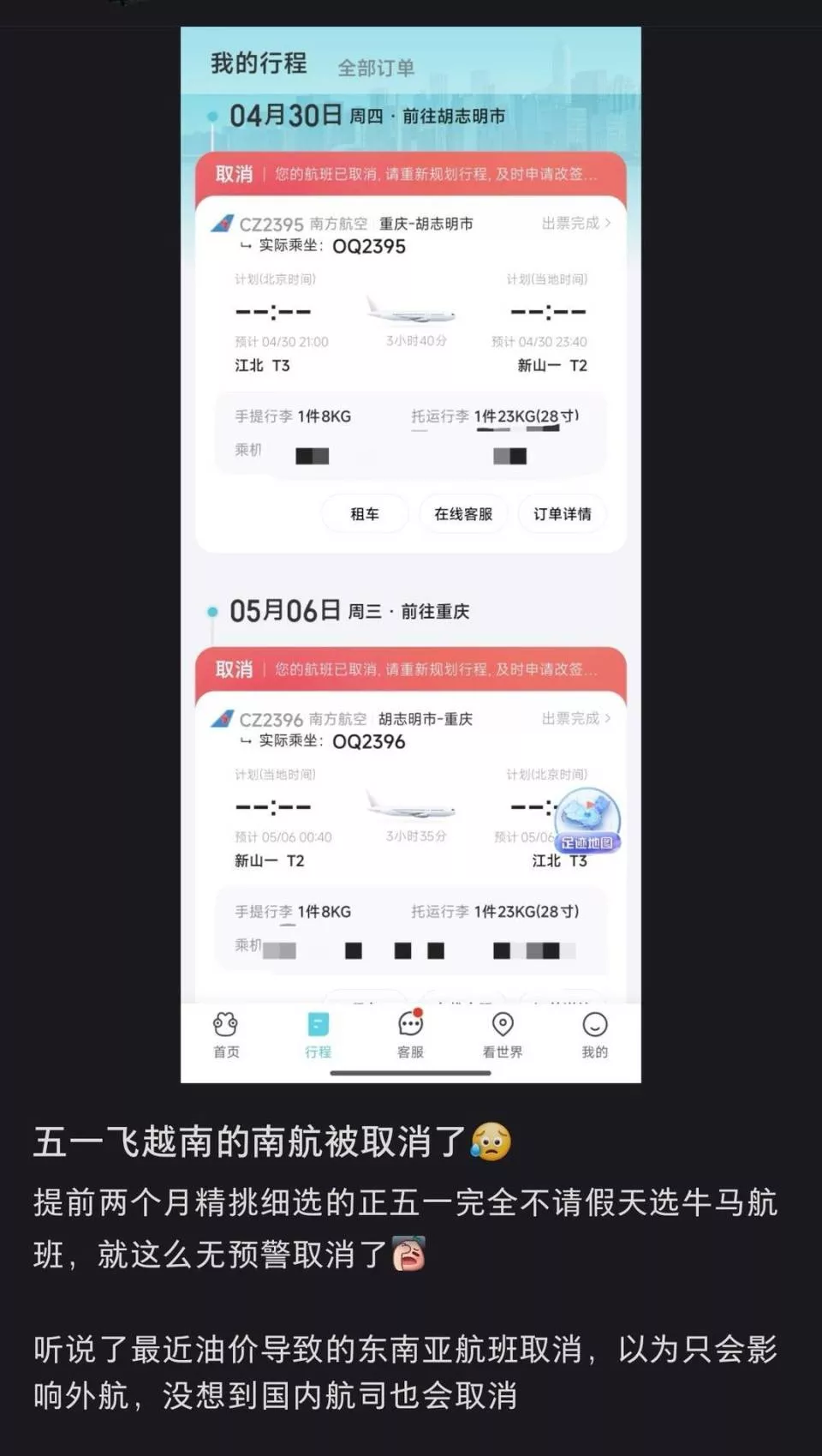 “五一”假期临近,不少人早已订好机票酒店。然而,近日社交平台上却涌现大量“航班被取消”的截图——从上海飞曼谷、成都飞吉隆坡、西安飞普吉岛……多条热门国际航线突然“停飞”。游客们措手不及,到底发生了什么?