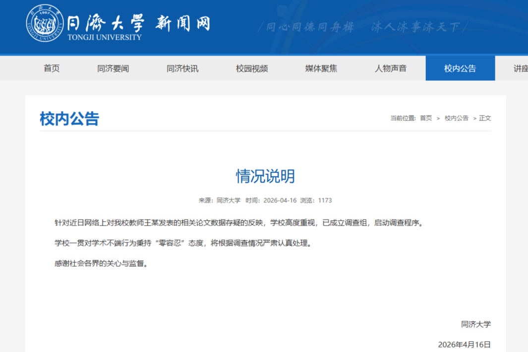 同济大学新闻网4月16日发布情况说明: 针对近日网络上对我校教师王某发表的相关论文数据存疑的反映,学校高度重视,已成立调查组,启动调查程序。 学校一贯对学术不端行为秉持“零容忍”态度,将根据调查情况严肃认真处理。 感谢社会各界的关心与监督。