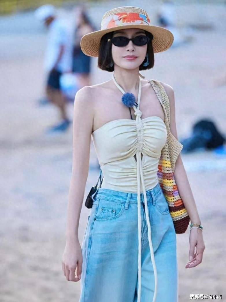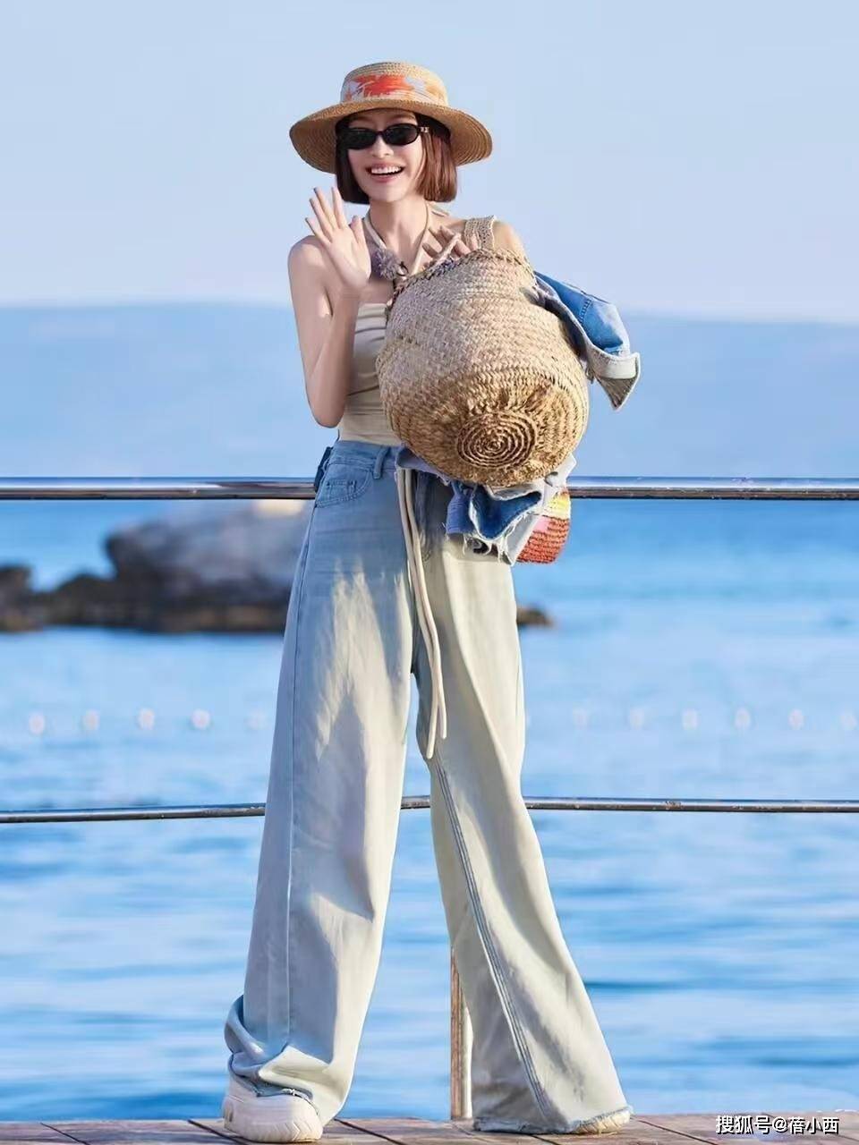这一身海边造型则是完全相反的松弛感,把少女元气感演绎到了极致,上身一件简约的米白色挂脖吊带,清爽利落,完美适配海边的氛围,低饱和色系温柔又显白,完全不挑肤色。下身搭配一条浅蓝水洗阔腿牛仔裤,高腰超长拖地的版型把腿长拉到一米八,宽松垂顺的裤型还可以把所有腿型问题全部藏住,走路带风的松弛感直接拉满。