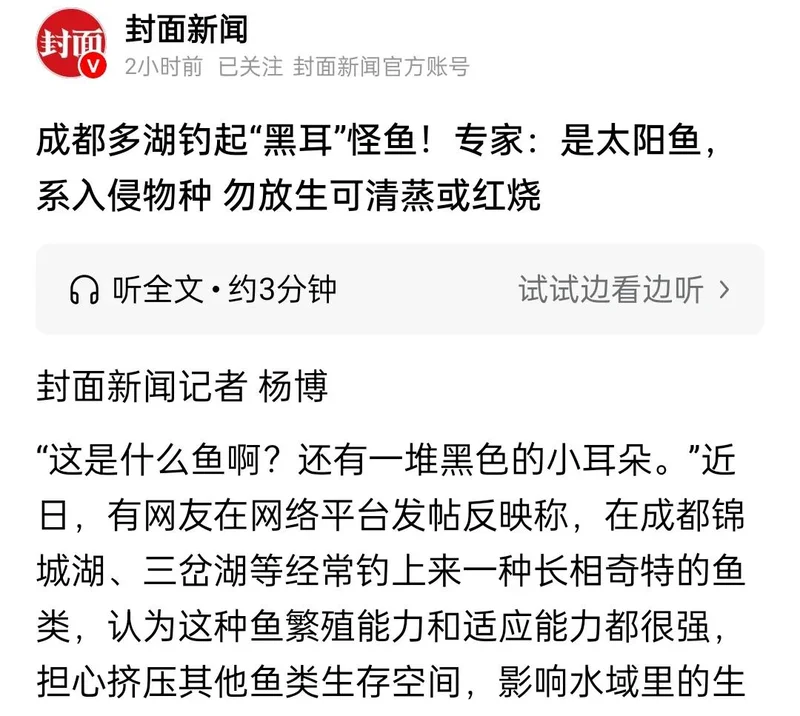 好在目前的太阳鱼主要集中在水库、人工湖,天然河流中较少,暂未到泛滥成灾的程度,仍处于可防可控的早期阶段。这个窗口期非常关键,一旦扩散至岷江、沱江等主干水系,再想治理就会付出数倍代价。