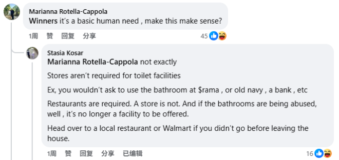 网友解释,商店并不要求配有洗手间 图源:Facebook