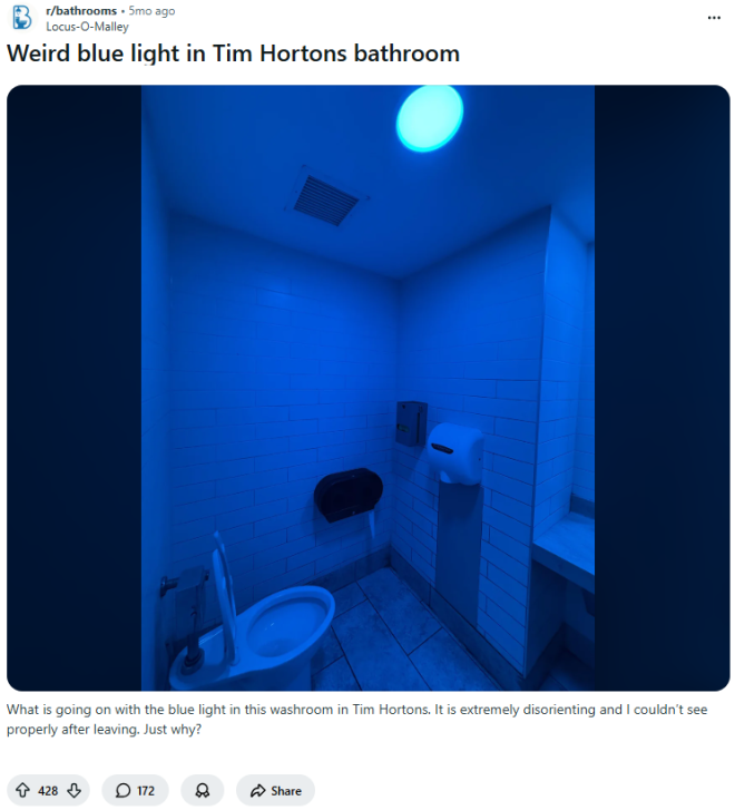 网友发现Tim Hortons蓝光洗手间 图源:Reddit